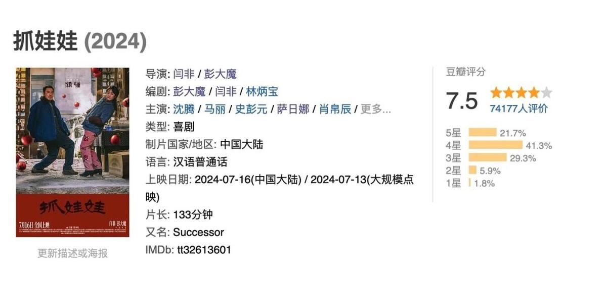 当今《捏娃娃》的豆瓣评分保持在7.5分,超7万东说念主给出的收获,评释了《捏娃娃》的品性。