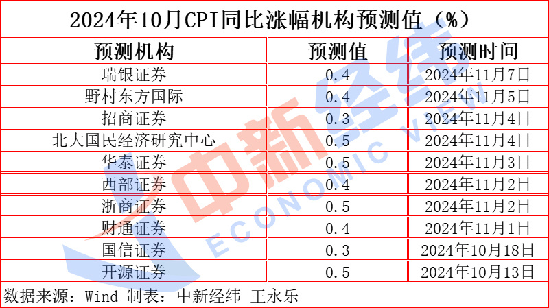 关于行将揭晓的10月CPI数据,Wind数据泄漏,规模11月8日,10家机构对10月CPI同比涨幅的预测均值为0.4%。从预测值来看,4家为0.5%,4家为0.4%,2家为0.3%。若按照机构预测均值策画,CPI同比连络九个月高潮。
