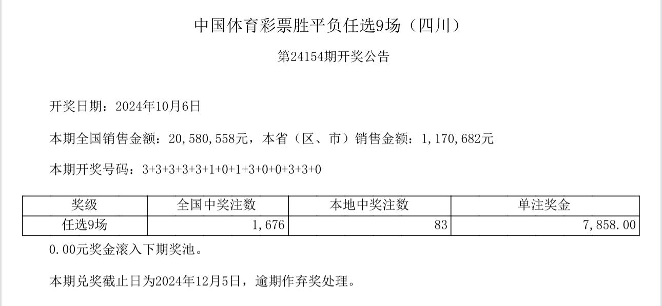 中国体育彩票胜平负任选9场第24154期天下销售金额:20,580,558元。开奖号码:3+3+3+3+3+1+0+1+3+0+0+3+3+0。