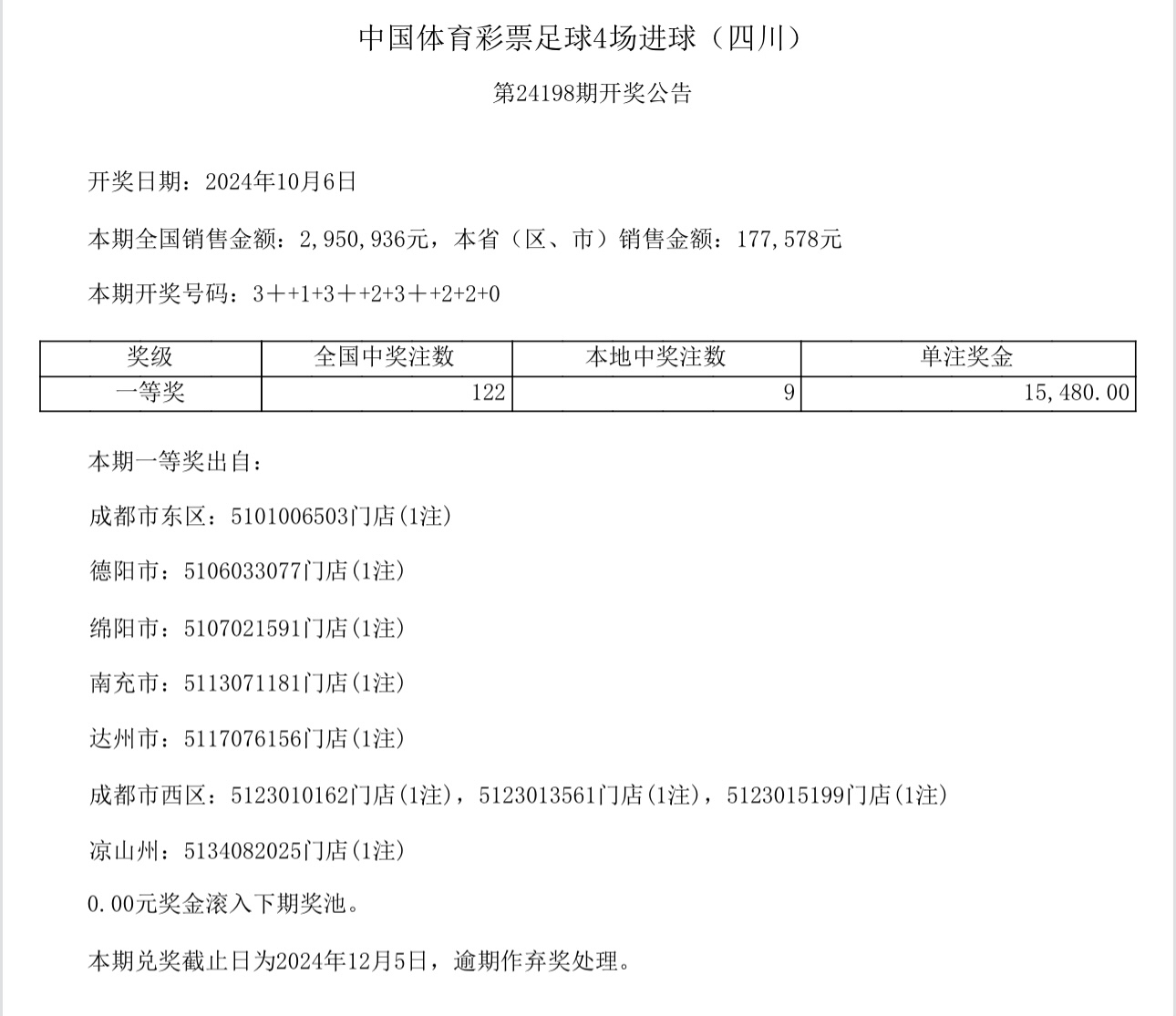 中国体育彩票足球4场进球第24198期天下销售金额:2,950,936元。开奖号码:3++1+3++2+3++2+2+0。