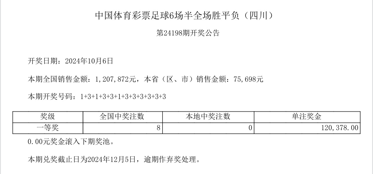 中国体育彩票足球6场半全场胜平负第24198期天下销售金额:1,207,872元。开奖号码:1+3+1+3+3+1+3+3+3+3+3+3。
