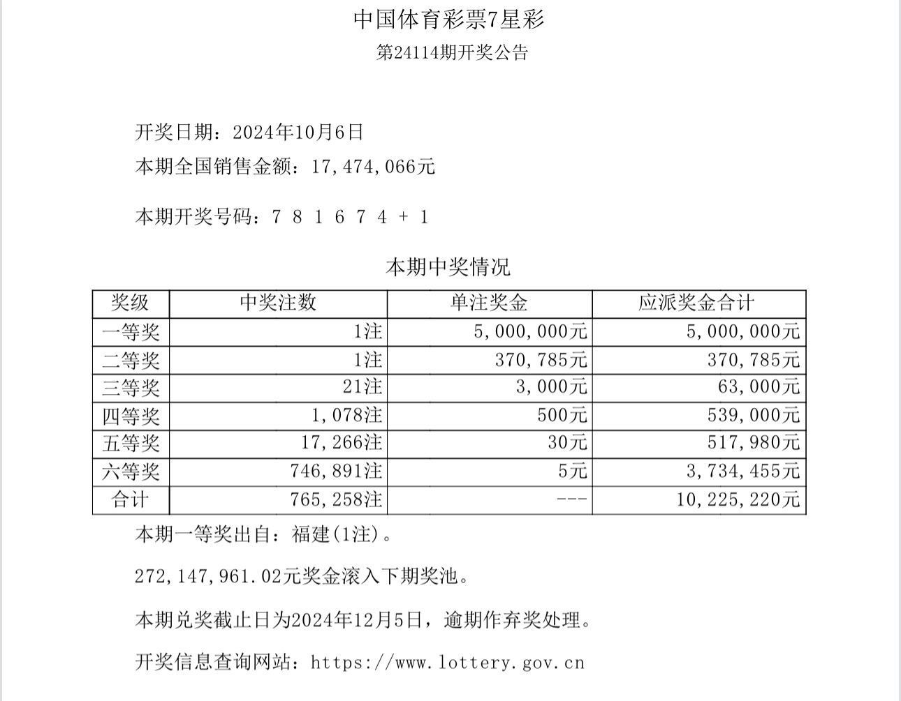 中国体育彩票7星彩第24114期天下销售金额:17,474,066元。开奖号码:7 8 1 6 7 4 + 1。