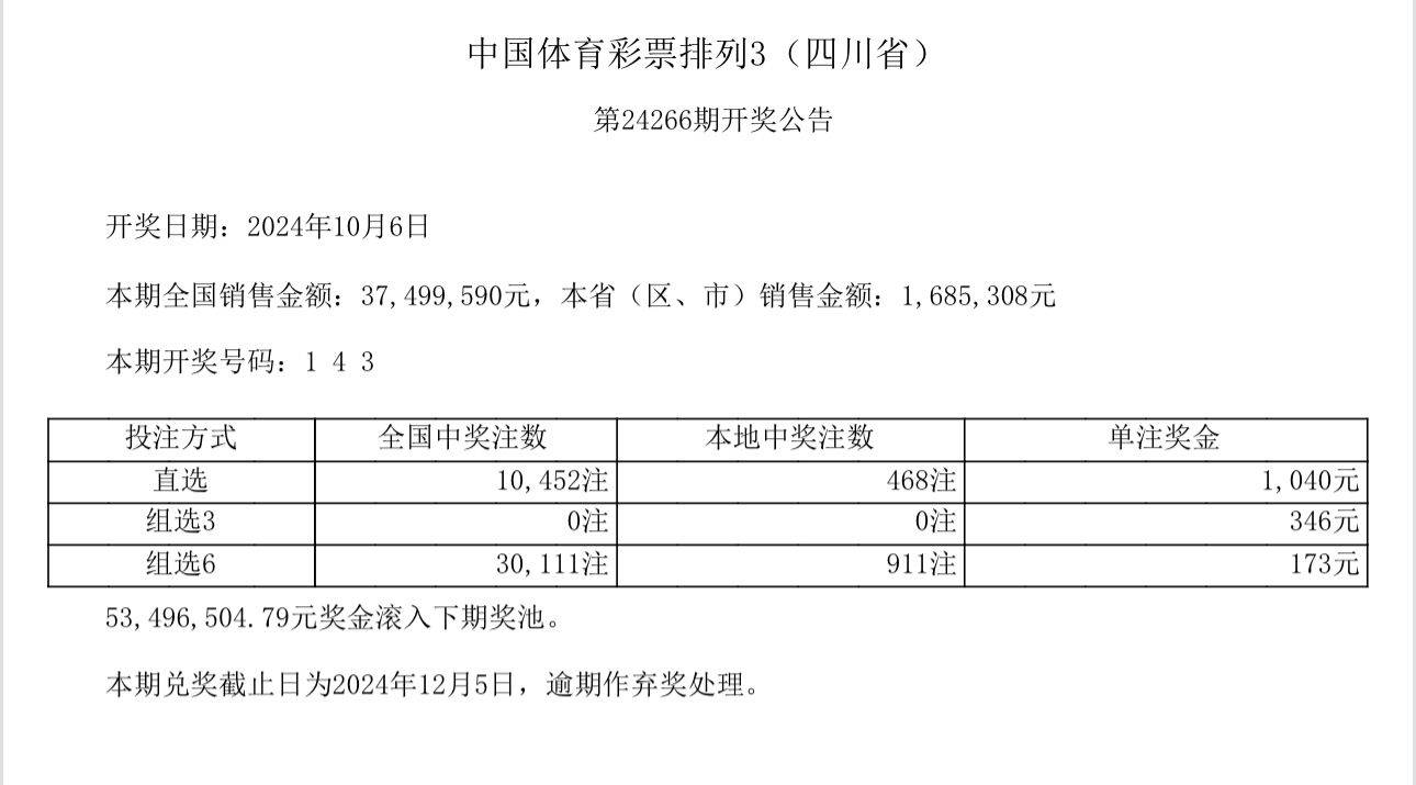 中国体育彩票摆设3第24266期天下销售金额:37开云网页版 (中国)官方在线登录,499,590元。开奖号码:1 4 3。