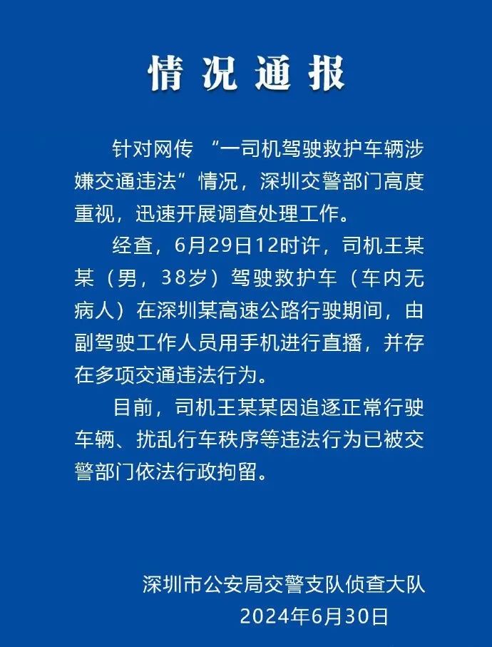 有一个细节是,司机王某某驾驶救护车在深圳某高速公路行驶本事,由副驾驶使命主说念主员用手机进行直播,并存在多项交通犯警行为。需要追问,这名司机和副驾驶使命主说念主员为何玩直播?王某某与副驾驶使命主说念主员是否有过肖似“前科”?这次因直播而事发,应以此为踪影,造访此前有无交通犯警行为。简言之,王某某与副驾驶使命主说念主员能否胜任救护车使命?