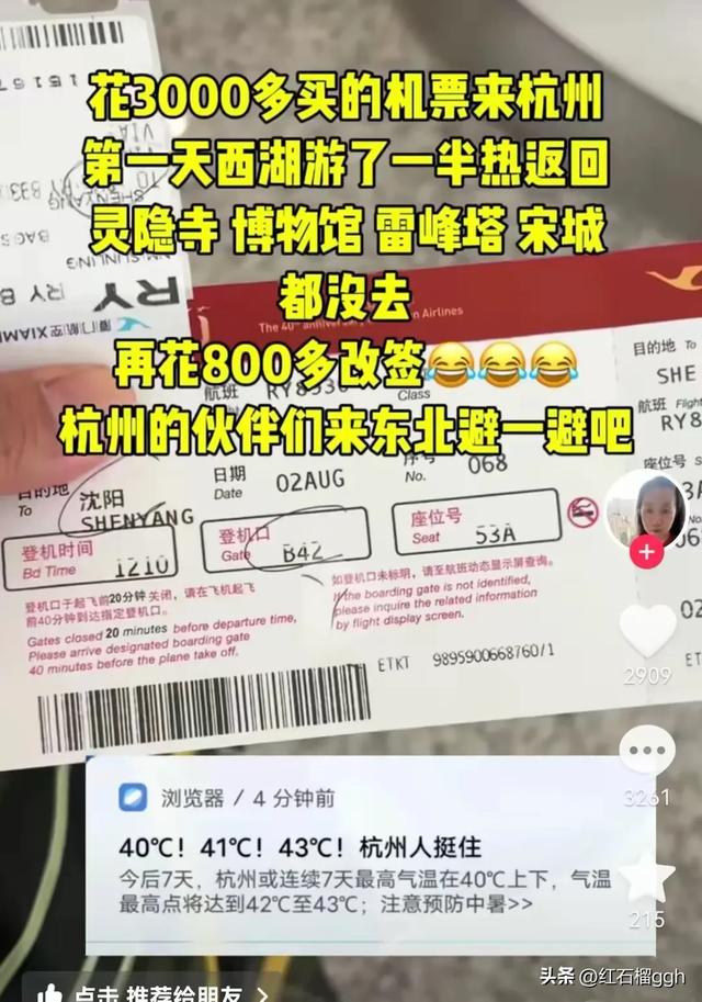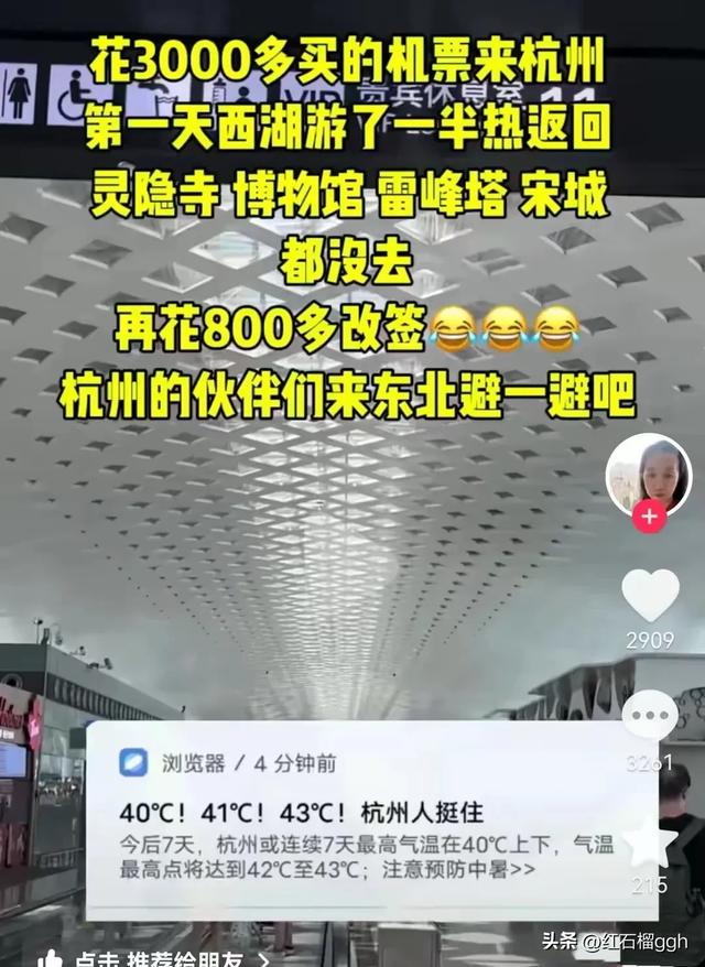 她当今落地的然而杭州啊,杭州属于南边,南边的夏天细目要比朔方要热。再加上本年大齐的气温高。杭州这几天的温度中午齐跳跃了40度,最高气温达到42-43度。